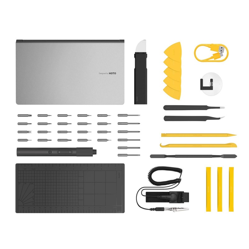 - PACKAGE INCLUDED: 1 x Electric Precision Screwdriver, 6 x Screwdriver bits-45mm, 20 x Screwdriver bits-28mm, 1 x Demagnetizer/Magnetizer area, 1 x Long metal spudger, 1 x Pointed-head spudger, 1 x Curved-head spudger, 1 x Spatula, 1 x Bent tweezers, 1 x Straight tweezers, 1 x Suction cup, 3 x Short spudger, 5 x Opening pick, 1 x Magnetic pad, 1 x Wrist strap, 1 x Type-C Cable, 1 x Clamshell workstation.