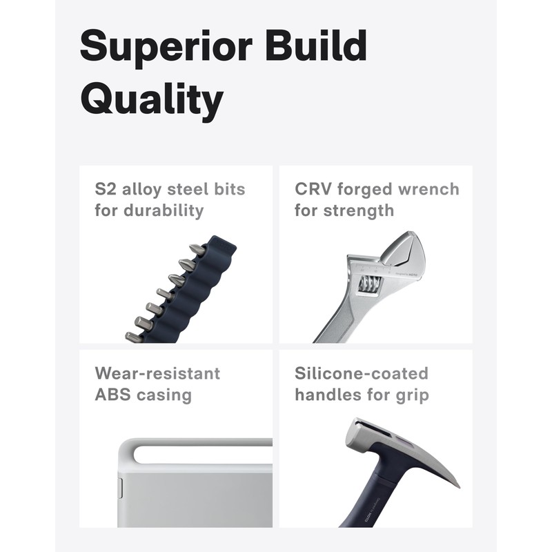 - OUTSTANDING APPEARANCE: HOTO tool set has minimalist and innovative shape design. Carefully designed details enrich the visual and tactile sensations. Toolbox with integrated design, smooth surface, fine texture, and neat interior. Hidden side buckles, for a smooth and neat buckle opening experience. Tough ABS material outer case, wear-resistant.