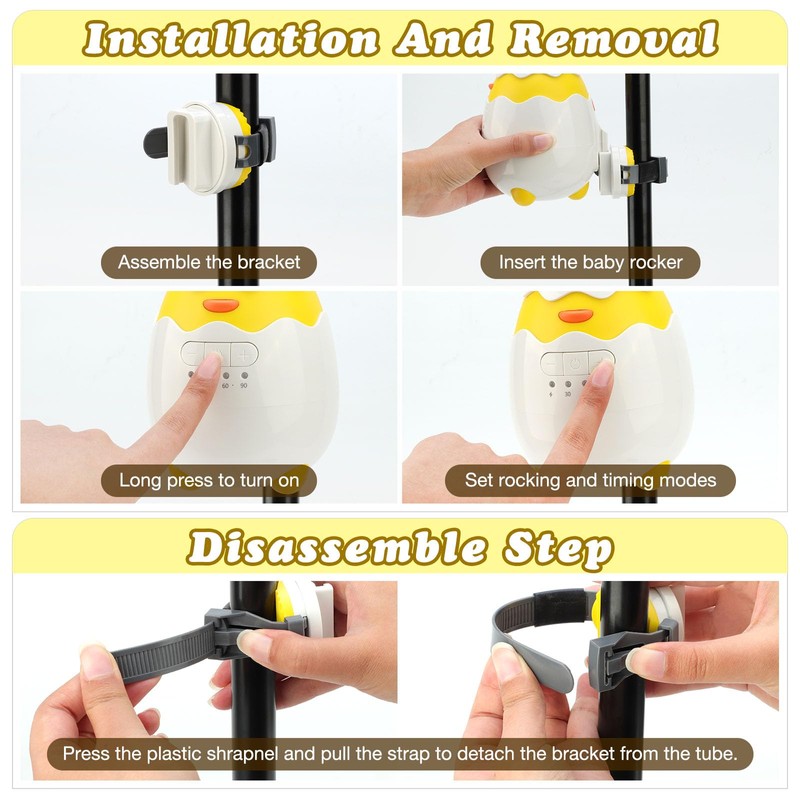 - 【Easy To Use】Simply attach the included stand to the stroller or baby carriage and turn the power switch to start rocking. Adjust the speed according to your baby's favorite rocking motion. Turn off the power to stop swinging, one-button design, no complicated operation mechanism, maximize the simplicity of use.