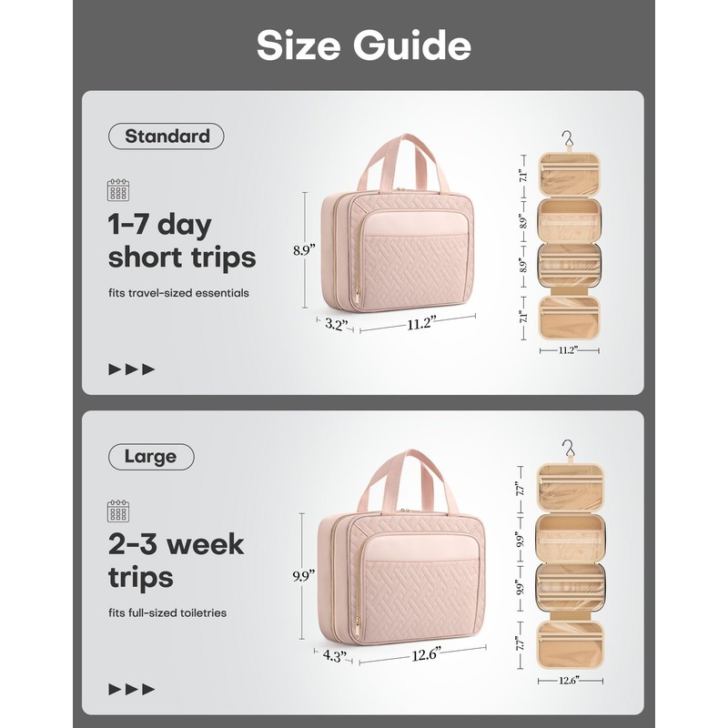 - SIZE GUIDE FOR EVERY TRIP: Choose the perfect size to match your travel needs. The standard cosmetic travel bag is ideal for 1-7 day trips, perfectly fitting travel-size essentials. For longer adventures, the large one accommodates 2-3 weeks'worth of full-sized toiletries. The HOTOR travel bag for toiletries ensures you have everything you need, no matter the journey.