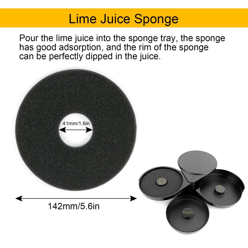 - Lime Juice with Sponge: Sponge covers the rim, gently press down on the cocktal glass to produce a perfect layer of juice to hold the salted or sugared rim.