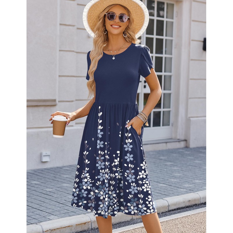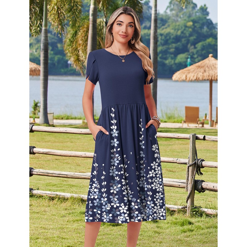 - 【Feature】: Short Sleeve Dresses With Floral Print And Solid Color, Crewneck,Short Petal Sleeves, 2 Side Pockets, Elastic Waistband, No Linning, Flattering Cut,Below Knee-Length,A-Line Style,The Fabric Neither Thin Nor Thick. Gives You A Casual And Stylish Look While Staying Cool And Comfortable