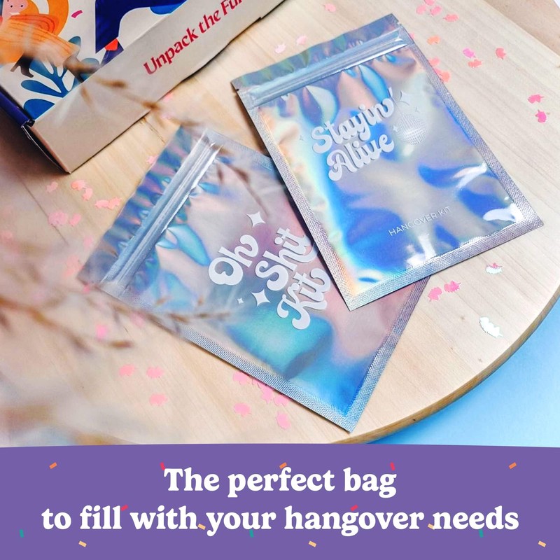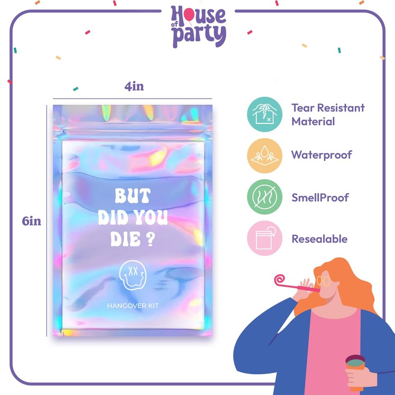 HOUSE OF PARTY Hangover Kit Bags - 10 Pcs | (5"x7") But Did You Die Printed Ziplock Storage bags | Preprinted Holographic Bags | Resealable Bags for Packaging, Travel and Bachelorette Party Favors