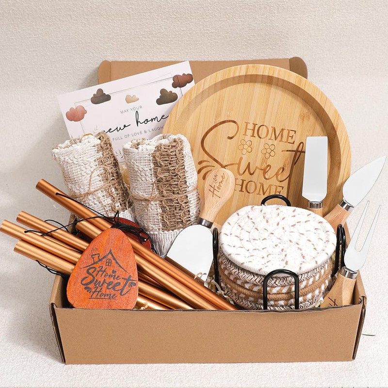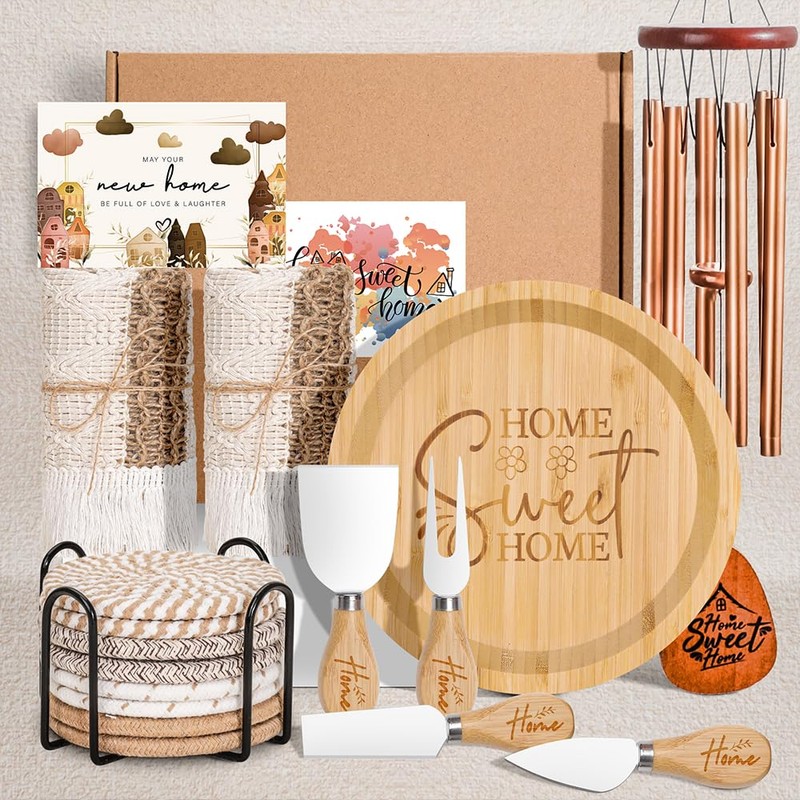 - 【Housewarming Gift Basket】 Home is where all the happy stories begin. This housewarming gift set includes a bamboo fruit plate, 6 bohemian style rope braided coasters as well as a coaster holder, 1 delicate housewarming wind chime, a set of 4 butter knives and forks, 2 napkins cloths, 1 blessing card and a beautifully wrapped box to wish the new homeowner a fresh start and new memories in this wonderful place.