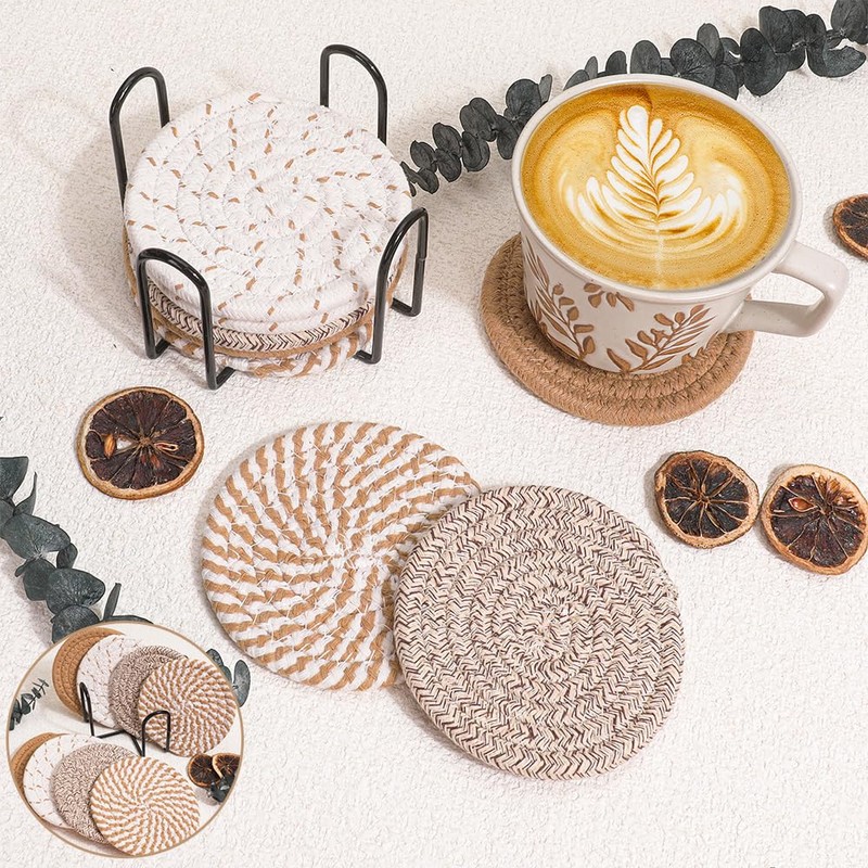 - 【Sweet Home Coasters】6 Round Rope Braided Coasters with beautiful and unique design, add bohemian style to the kitchen or coffee table, they will remind you to relax, cozy and happy! Enjoy your coffee, tea or wine in the elegant and relaxing atmosphere that these coasters bring.