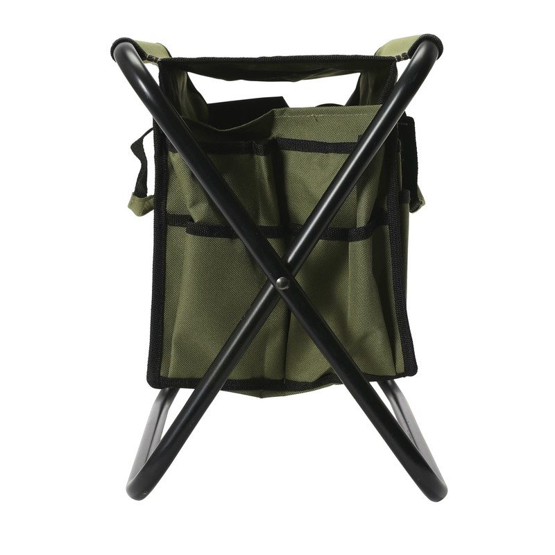 - Olive green canvas and black metal collapsible utility stool; 20 integrated storage pockets in various sizes, 2 attached handles for portability, and can be swiftly transformed into a tool bag with removable frame
