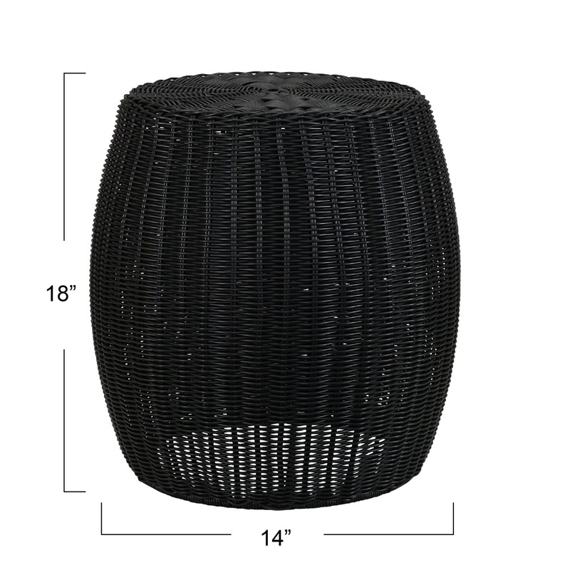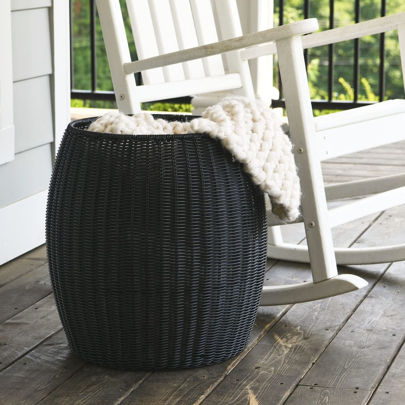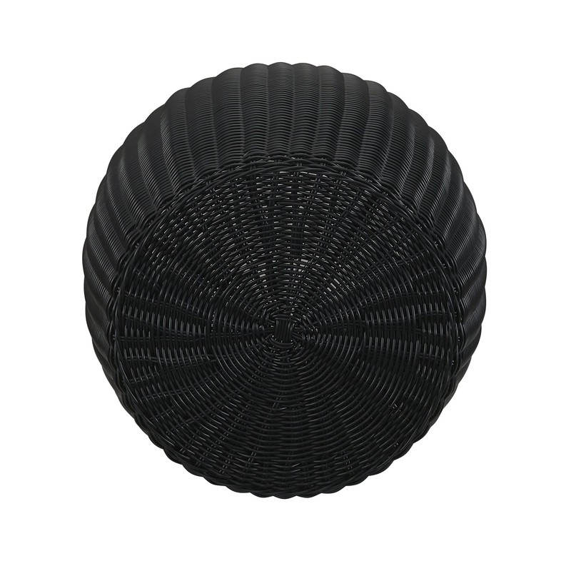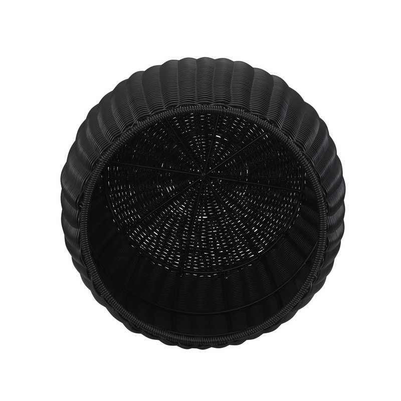 - This elegant basket side table has a pleasant bohemian aesthetic with its curved profile and dark black resin weave–the perfect addition to any indoor or outdoor seating area.