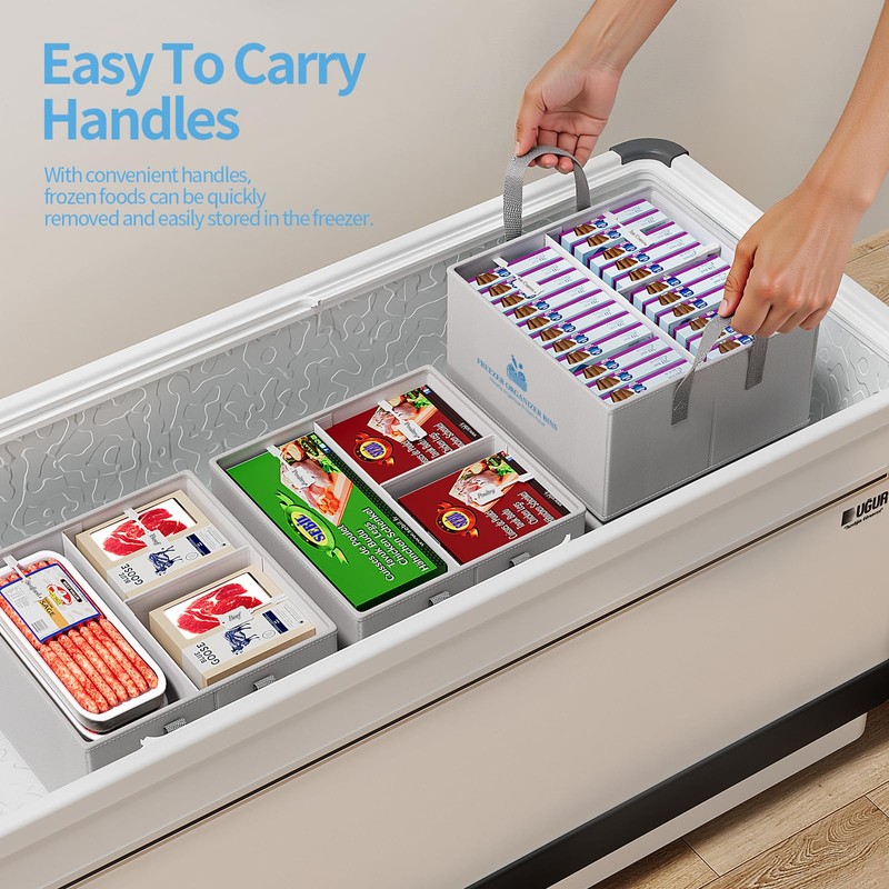 - Efficiently Organize Frozen Foods: Measuring 14 x 14 x 9 in, these large capacity deep freezer organizer bins can keep pork, beef, chicken, pizza, ice cream and other frozen foods well organized with magic tape dividers. Use the labels to make every ingredient clear at a glance, help you manage your refrigerator easily and keep the interior clean and tidy.