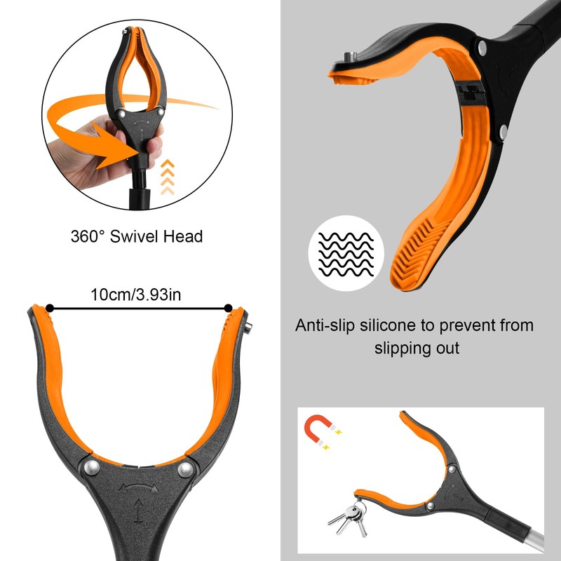 Rotating Reacher Grabber is made of premium aluminum alloy materials. Increases the reach range to 43 inches so that you can pick up items from the floor, top shelf, outdoor lawn, trash can, behind furniture, or other hard-to-reach places.
