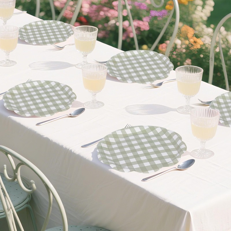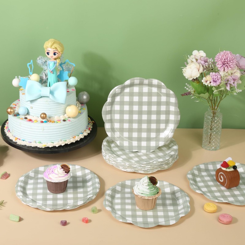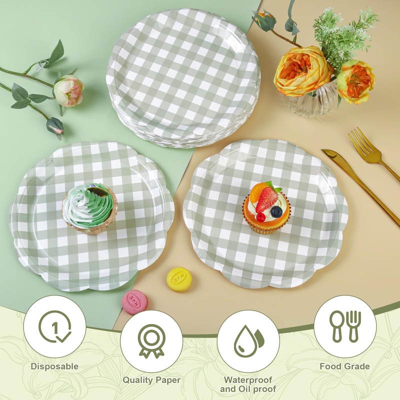- Sage Green Gingham Paper Plates: There are 48 pieces of 9 inch sage green gingham plates, which are made of quality thickened paper, Surface of plates are covered with a coated inside to prevent oil penetrate, safe and reliable. you can place dessert, cake, cookie, fries or other food on the disposable scalloped gingham plates