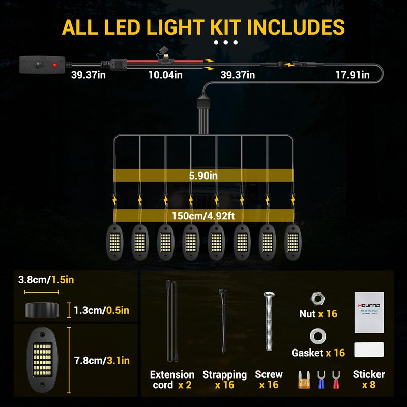 - 【Warranty & Complete Kit】Package includes: 8x LED pods, 1x wired switch, wiring harness, 8x screws/nuts, 16x zip ties, 8x white double sided tape, 1x manual.