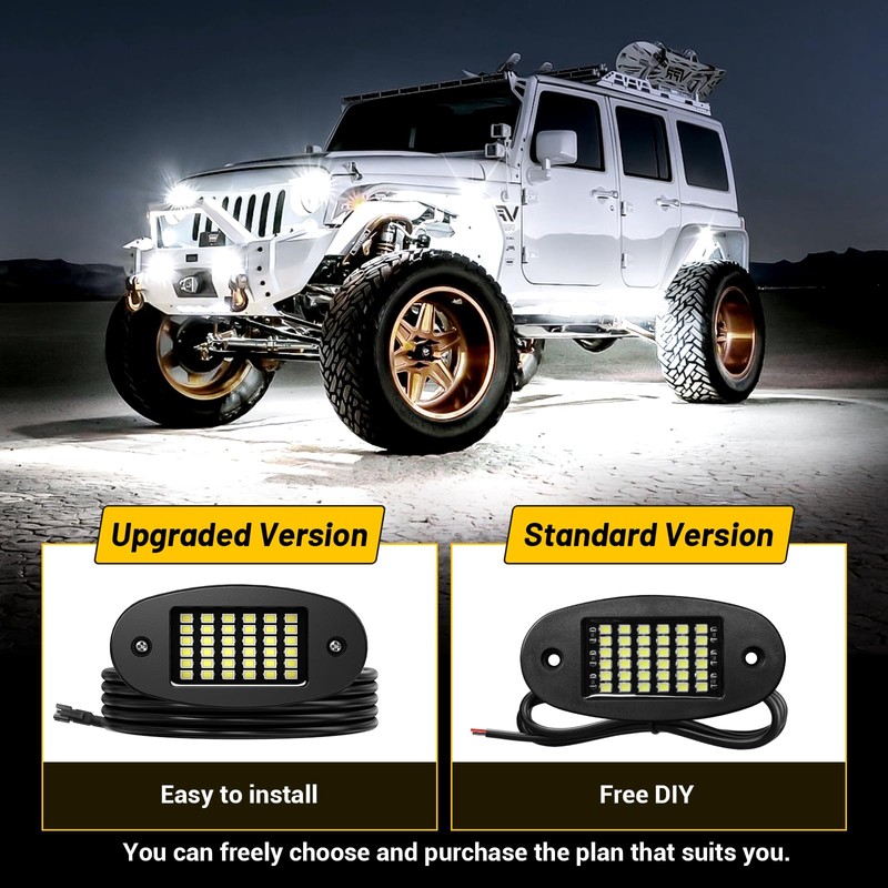 - 【280 Super Bright LEDs & 6500K Pure White】Upgraded with 280 high-intensity LEDs (36 per pod), this rock light kit delivers 6500K pure white illumination, 30% brighter than standard RGB lights. Perfect for night driving, foggy roads, or off-road adventures, it enhances visibility and safety while creating a sleek modern look.