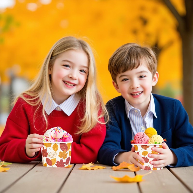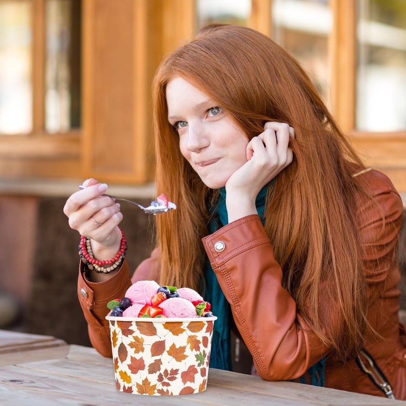 - Paper Material: Our fall disposable dessert bowls are made with BPA-Free food grade strengthened paper making them a great fit for ice cream, frozen yogurt, parfaits, snacks, and more! Hot or cold, our cups will take care of your frozen treats or hot soup, chili, and more. interior of the paper ice cream cups for Thanksgiving party supplies are features a leak-resistant coating to prevent unwanted mess and spillage!
