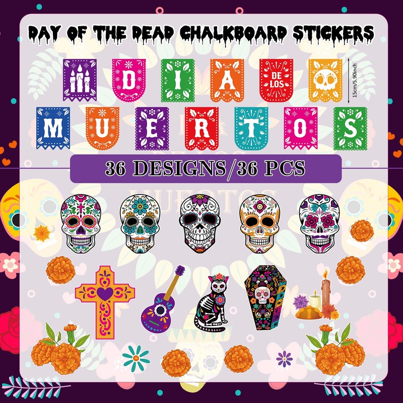 - Day of The Dead Colorful Bulletin Board Decorations Include: You will receive 36 pieces Day of The Dead theme board decorations, designed in 36 pieces different Cutouts with 120 pieces adhesive dot; Sufficient quantities and diverse styles can easily meet your party decoration needs.