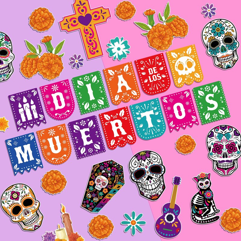 - Mexican Dia De Los Muertos Theme Design: Our Day of The Dead skull bulletin board Cutouts are wonderfully printed paper and exquisite cut, including “Dia De Los Muertos”, sugar skulls, chrysanthemums, crosses, Mexican flags, fiddles, candles, cat and more.