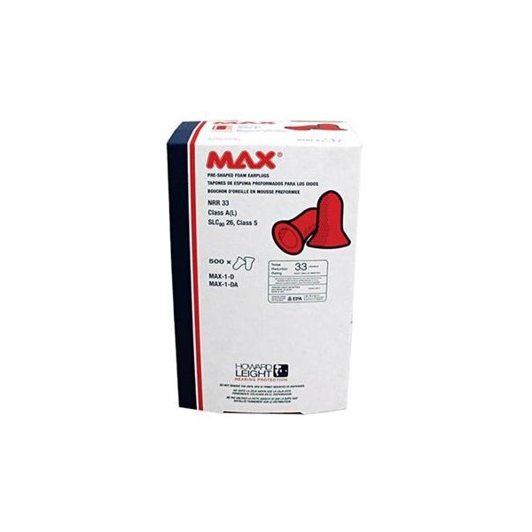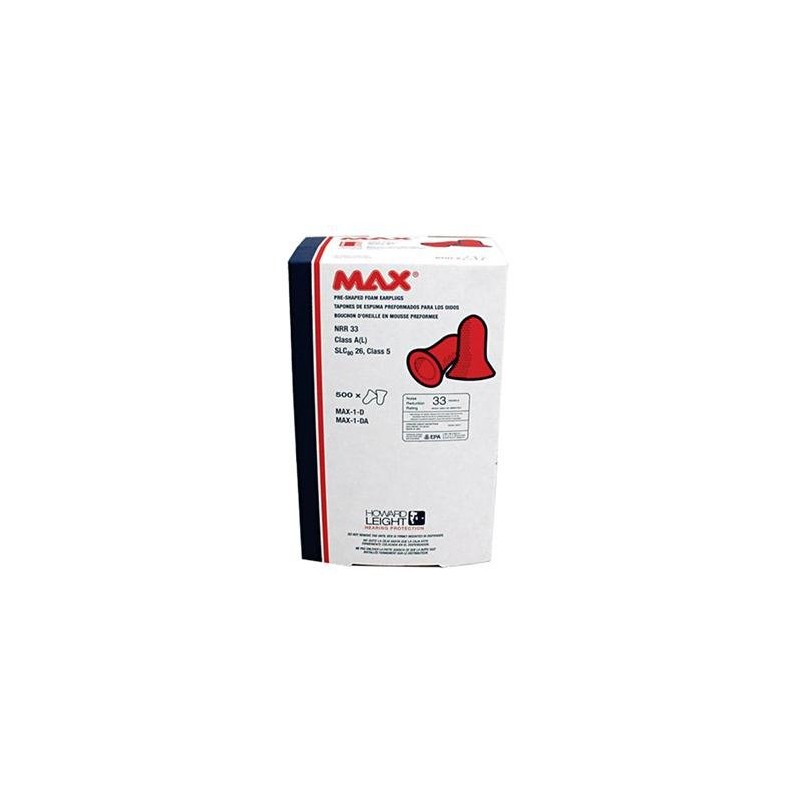 PREMIUM FOAM EARPLUG 3301165 Howard Lite Max Refill LS500 MAX (NRR 33) pre-shaped foam earplugs feature a smooth outer skin for maximum user comfort. The NRR 33 rating makes the MAX the highest rated disposable earplug in the U.S. The smooth, soil-resistant skin helps prevent dirt from penetrating the surface prior to insertion. Attenuation tested in accordance with ANSI S3.19-1974. Coral color, packed in poly bags. Rating: NRR 33, SNR 34 , SLC80 (corded) 27.5, SLC80 (corded) 27.0 CSA A(L)