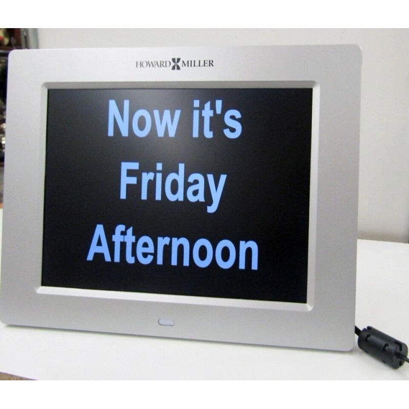 This clock may be used as a wall clock or a table or desktop clock. The clock clearly displays the day, time, and month without using abbreviations and clearly spells out the full DAY of the week and the MONTH (and date) in large, bold letters - without confusing abbreviations. You may select whether the clock displays the time, day and date or simply "Now it is Wednesday (day of the week) morning, afternoon evening or night.