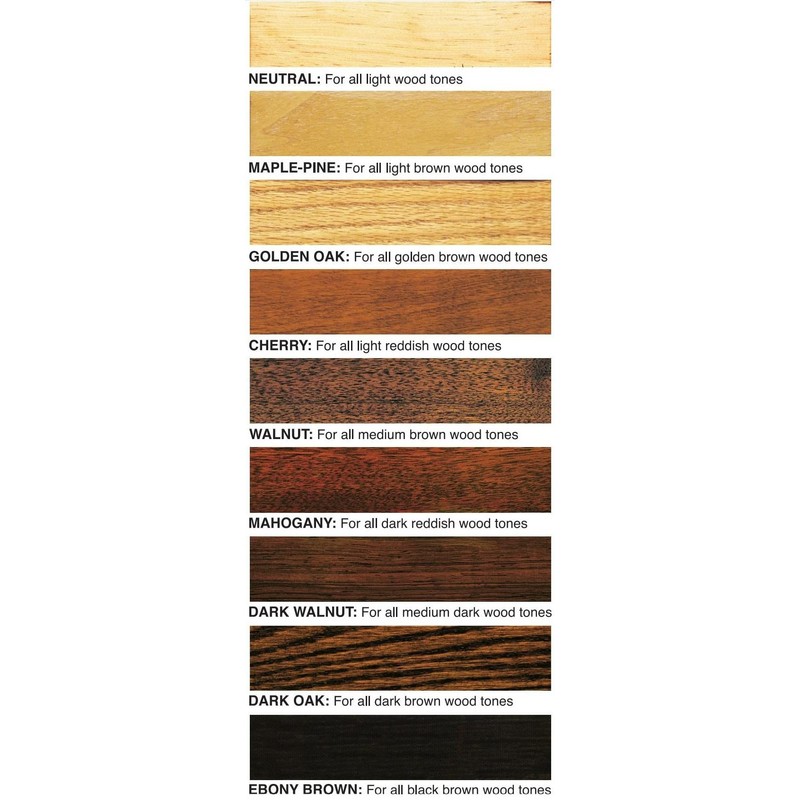 - Available in nine colors to match almost any wood finish tone; Neutral, Maple-Pine, Golden Oak, Cherry, Walnut, Mahogany, Dark Walnut, Dark Oak, and Ebony Brown