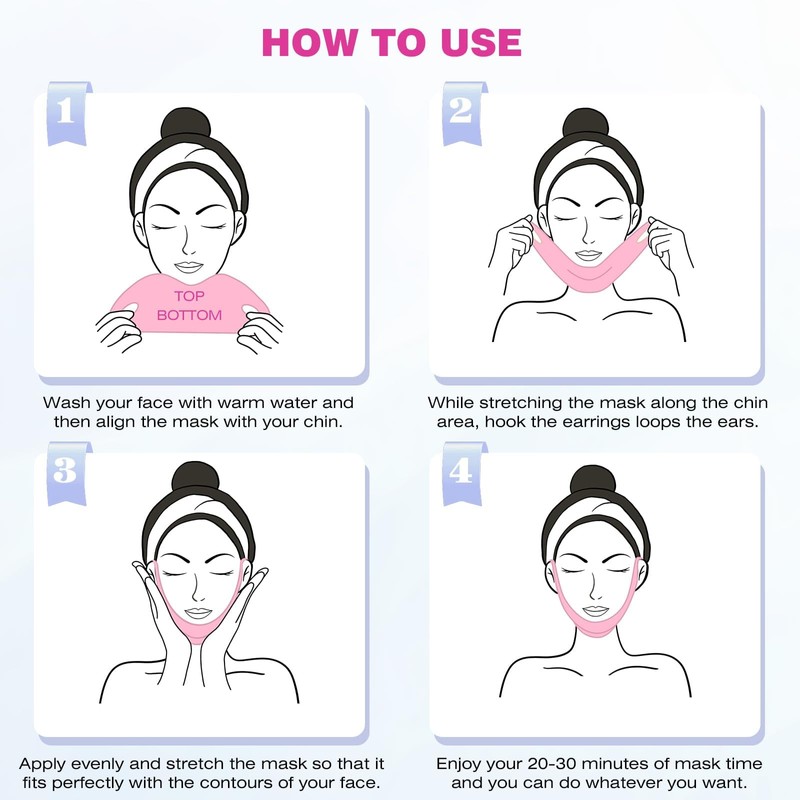 - Easy To Use: Our Double Chin Mask has good elasticity. Simply lay the mask flat before use and stretch it a few times to fit your contours, leaving your chin and cheeks well moisturized and lifted. Since everyone's size is different, we recommend that if you feel the mask is pulling too much on your ears, we suggest you remove the mask and stretch it a few more times before applying it.