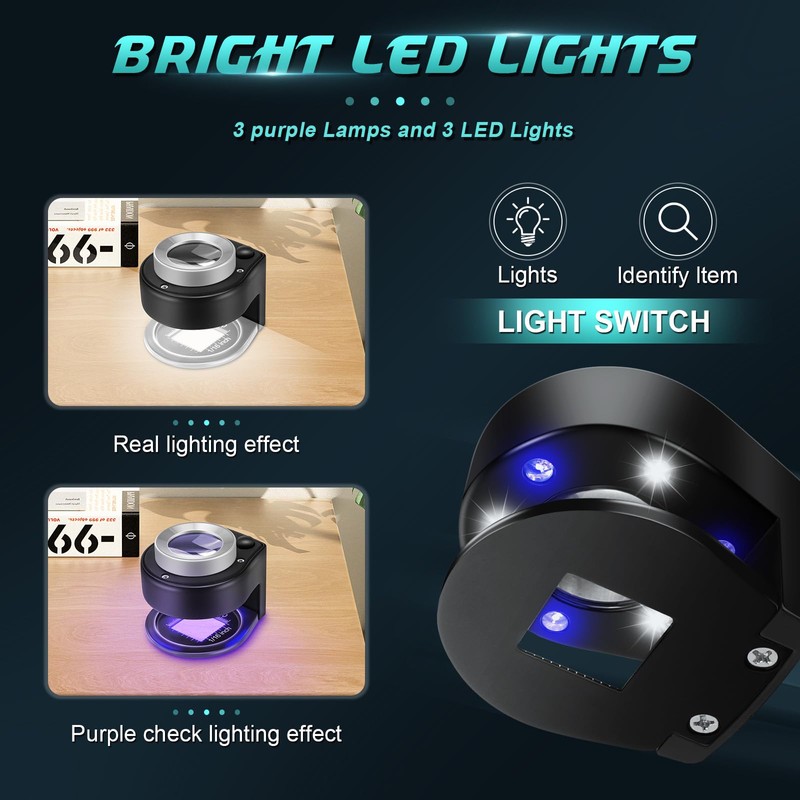 - RECHARGEABLE BRIGHT LED LIGHTS: The Jewelry magnifier equipped with white light and purple light. Sustainable use for 5-10 hours(Come with Type-C). It is easy to switch between different lights, with a scale at the bottom to obtain more accurate proportional data.