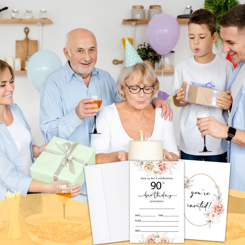 HQLOW 20PCS 90th Birthday Invitations for Women, Double-Sided Invitations with Envelopes, Party Invitation, Birthday Party Supplies -09