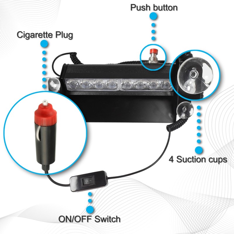 This 8 LEDs emergency warning flashing light comes with cigarette plug adapter with 4 suction cups for easy mounting to DC-12V any vehicles. Suction cups on mounting brackets make it very easy to mount the unit. The unit is adjustable to suit the angle of your windscreen. The housing of the unit is constructed of sturdy aluminum.