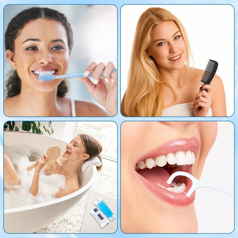 - Good Material: Disposable toothbrushes and combs made of plastic. The toothbrush is made of soft bristles, while the comb is strong and light. 14g Mint toothpastes, floss picks, mini shampoo bodywash and soaps provide a deep, smooth clean for your teeth, body, hand and more