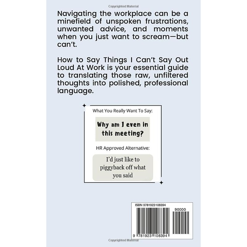 Disclaimer: Please note that this book contains profanity. While it's meant for entertainment, it may not be suitable for all audiences!Navigating the workplace can be a minefield of unspoken frustrations, unsolicited advice, and moments when you want to screambut can't. How to Say Things I Can't Say Out Loud At Work is your essential guide to translating those raw, unfiltered thoughts into polished, professional language.This book offers a collection of witty translations that help you express yourself without burning bridges unnecessarily!Whether it's dealing with a clueless coworker, managing unreasonable demands, or simply trying to keep your sanity intact, this book provides the tools you need to communicate effectively and hopefully keep your job.