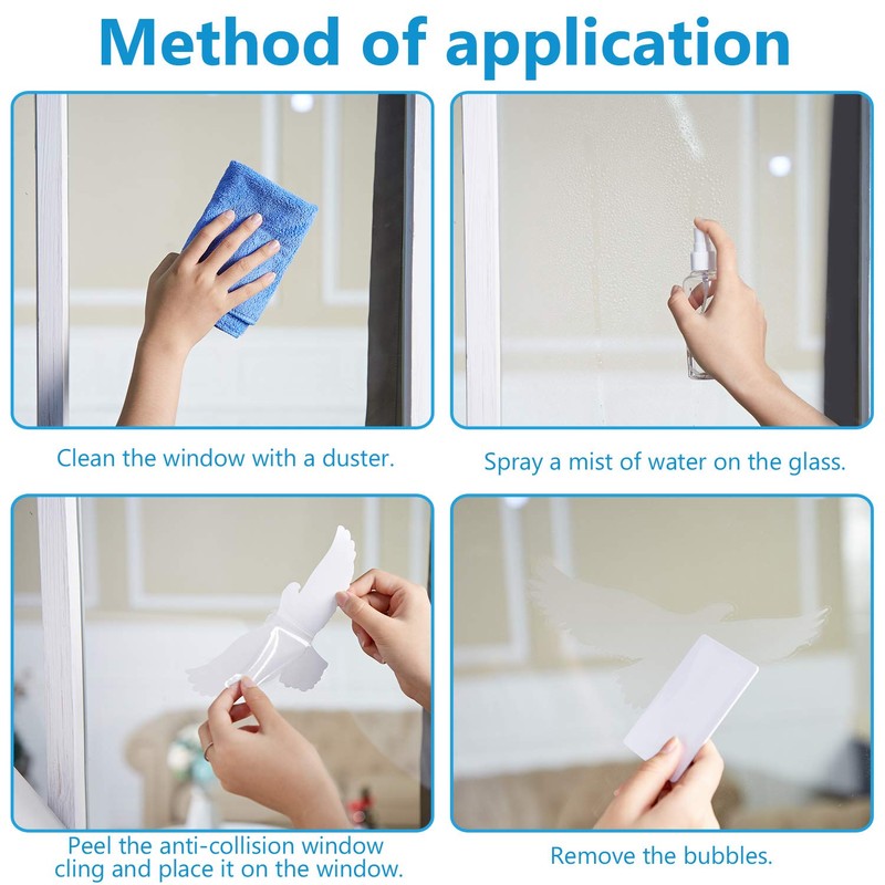 - 組み立て簡単: 最初にダスターで窓をきれいにします; 次に、ガラスにミストを噴霧します; 次に、ビニールの裏から衝突防止窓のくっつきを剥がし、お好きなデザインで窓に置きます; 再配置したい場合は、剥がして移動してください。