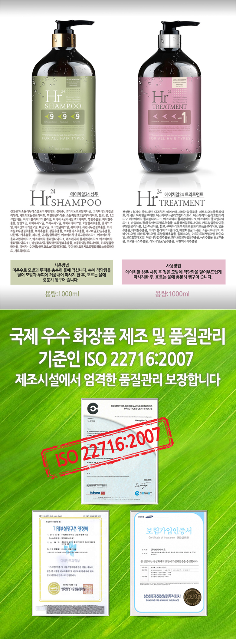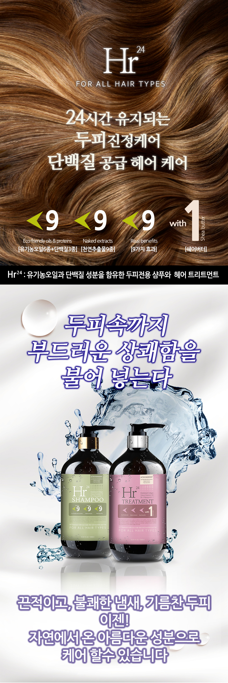 Hr24 단백질 대용량 두피 약산성 무실리콘 샴푸 1000ml자연유래 계면활성제