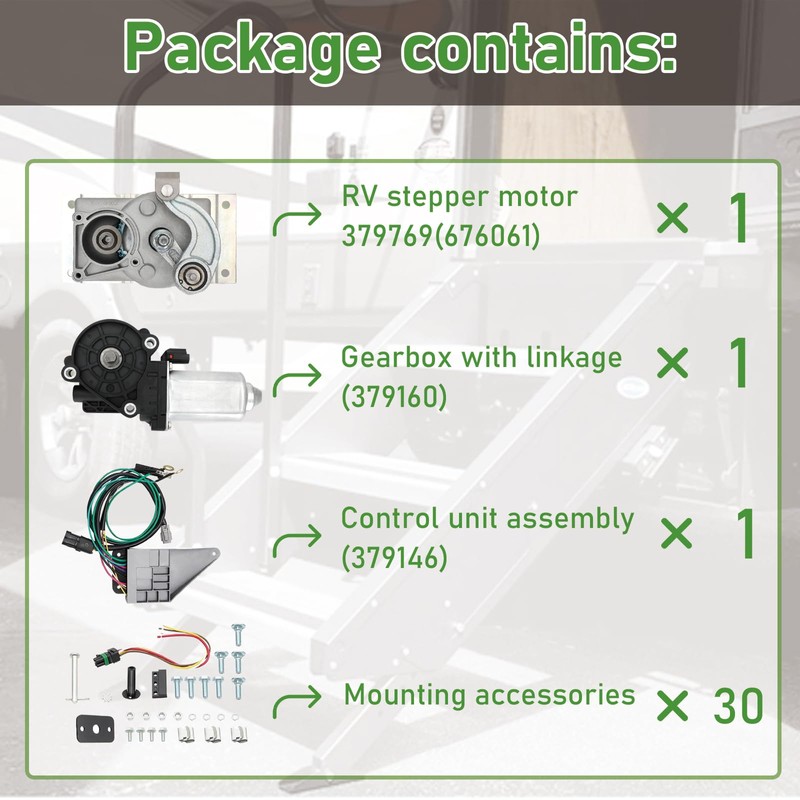 - ✅Package contains: 1* RV stepper motor 379769(676061), 1* Gearbox with linkage (379160), 1* Control unit assembly (379146), 30* Mounting accessories.