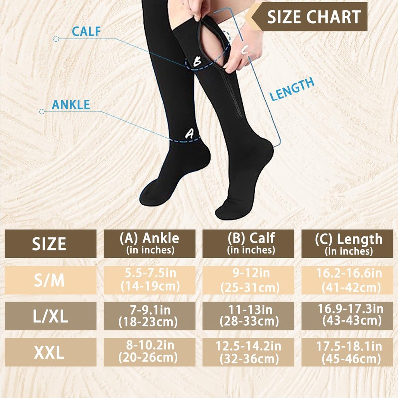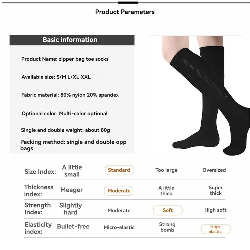 - 【Compression Socks with Zipper Full Foot Design】 This compression sock features an innovative zipper design for easy on and off, while providing a pressure value of approximately 20-30mmHg to improve blood circulation.