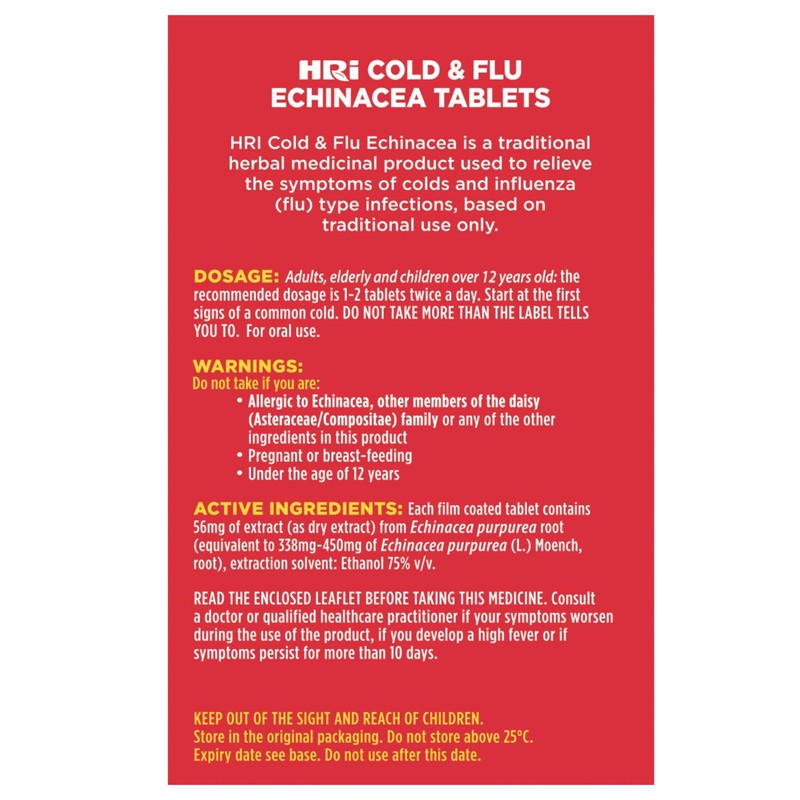 - Support Your Immune System: HRI Cold & Flu Echinacea tablets for the relief of cold and flu symptoms such as a sore throat, cough, runny nose, congestion and heaviness in the head