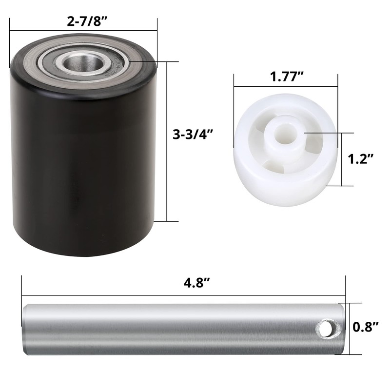 • Wheel Diameter: 2-7/8"; Wheel Width: 3-3/4"; Bearing ID: 20mm or 3/4". This particular wheel size is very common for import pallet jacks.