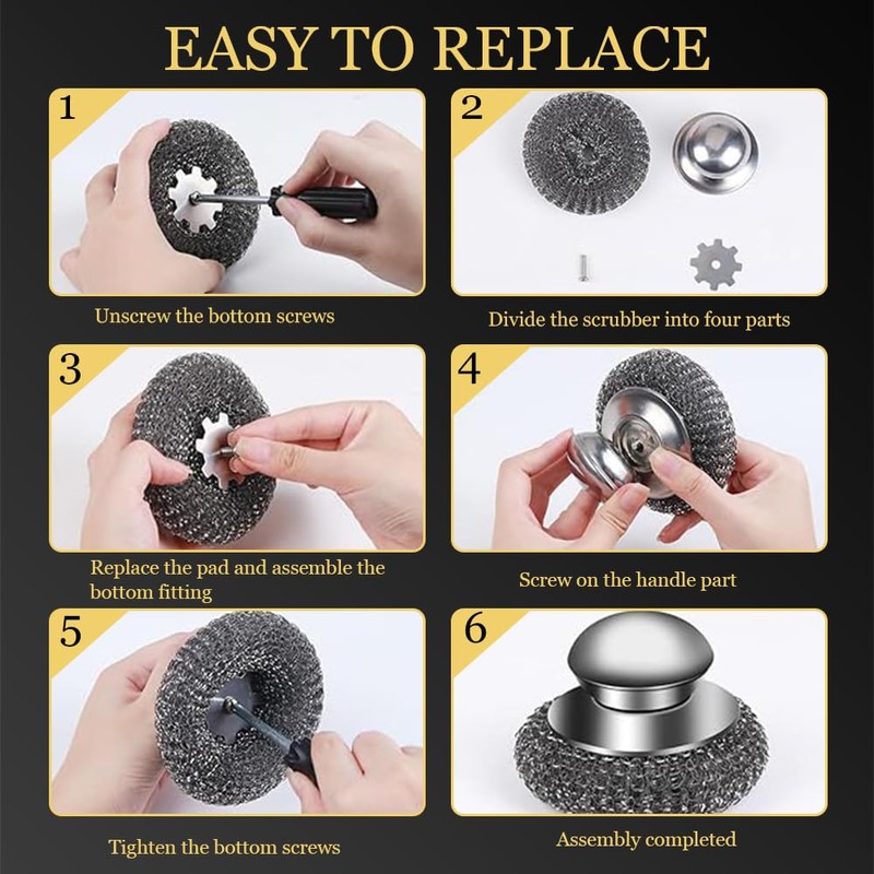 - SCRUBBER WITH HANDLE Our upgraded steel wool with handle, the perfect alternative to conventional steel wool pads. Designed for ergonomic comfort and effortless cleaning, this innovative tool ensures that your hands stay protected from oil stains.