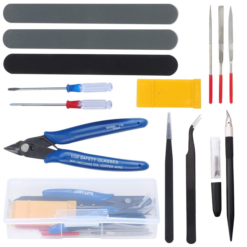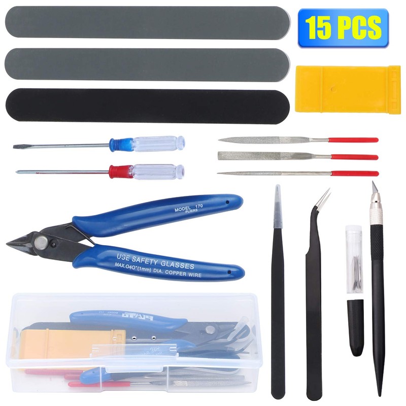 • 🎁 FULL RANGE AND COST EFFICIENCY: Modeler's basic tools include: 2 tweezers, 3 files, 3 double-sided polished rods, 1 pruner, 1 set of 5-piece cutters, 1 diagonal pliers, 1 separator, 2 pieces screwdrivers, 1 box. And the items are protected by a plastic box in case of damage. Meet all basic requirements for beginners.