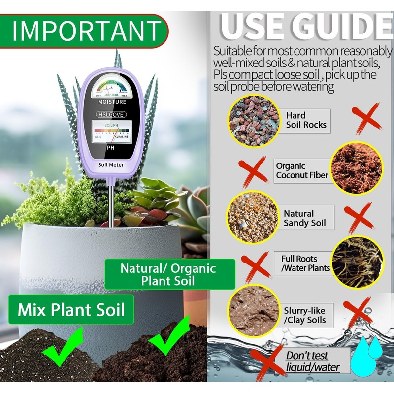 - NO WORRY SERVICE & IMPORTANT TIPS: - HSLGOVE aims to provide zero risk/ satisfactory service for our users, we'd like to address any issues or concerns you have. If you have any questions, please be sure to contact us to solve for you. Tips: Don't test any liquid! Don't force it into hard/too loose ground/soil! Don't forget to wipe the soil probe after each use.