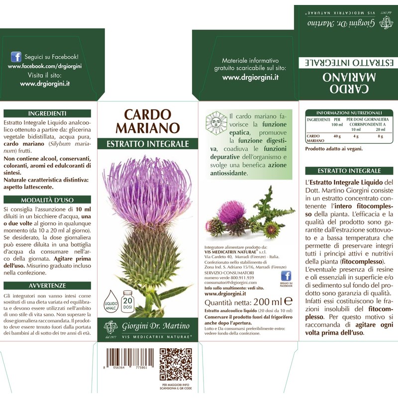 Il cardo mariano favorisce la funzione epatica, promuove la funzione digestiva, coadiuva le funzioni depurative dell'organismo e svolge una benefica azione antiossidante. Prodotto con etichettatura in lingua italiana. Codice Farmadati: 970448799.
