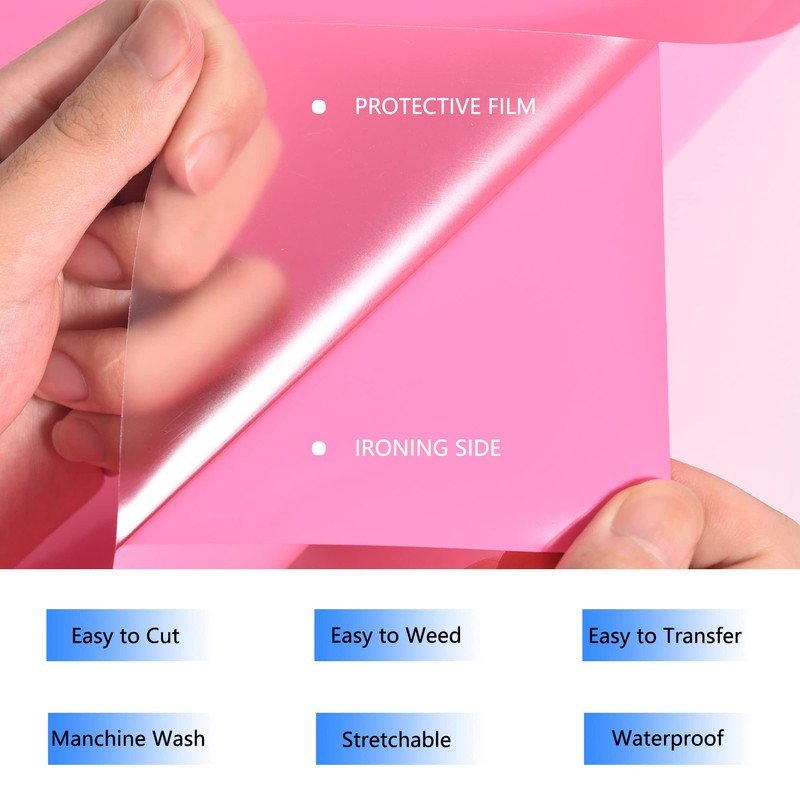 - Durable & Eco-friendly:Each HTV holds up well after repeated washes, without cracking, fading and peeling. Since it's SGS certified, our Pink htv roll is safe to apply on kids clothing.