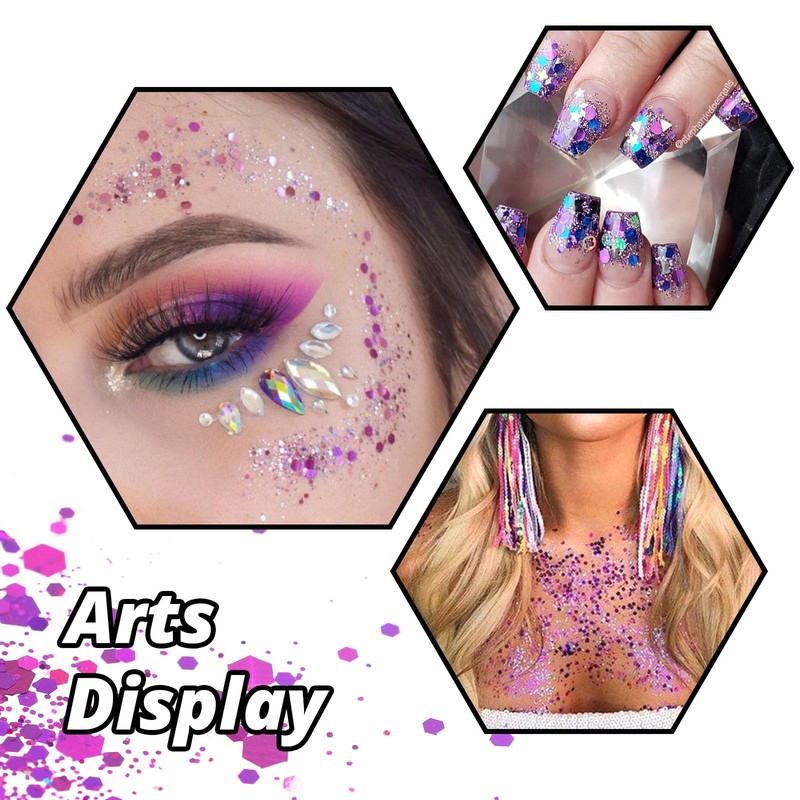 - STUNNING HOLOGRAPHIC EFFECT. Mixed different size hexagonal sequins and fine glitter, our holographic glitter performs an extraordinary effect different from ordinary craft glitter. This chunky glitter for crafts offers a metallic finish while providing a secondary rainbow finish. It shines differently in dazzling colors in different light angles, taking on a sparkling holographic color. Add sparkle, shine, and texture effects to your projects