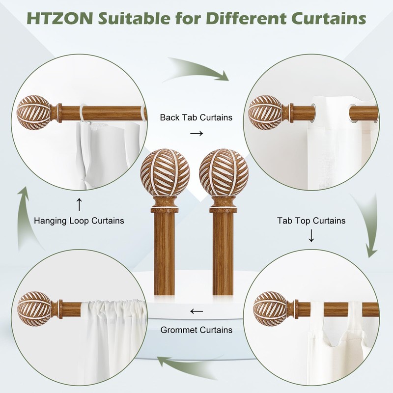 - HTZON Imitation Wood Grain Curtain Rod: Curtain rod finials are professional designer inspired by the shape of the leaves, handmade craft imitation leaf spherical shape, hand-carved, hand-colored, imitation wood grain color. Rustic and thick natural visual effect,original wood grain leaf ball curtain rods,applicable to all kinds of windows in your home with beautiful curtains.