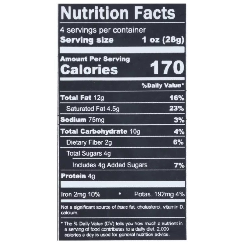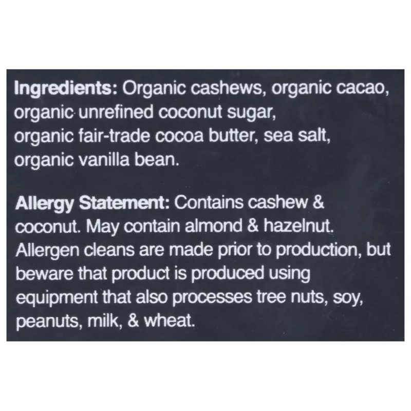 Organic Cashews, Organic Cacao, Unrefined Organic Coconut Sugar, Organic Fair-trade Cocoa Butter, Organic Vanilla Bean, Sea Salt.