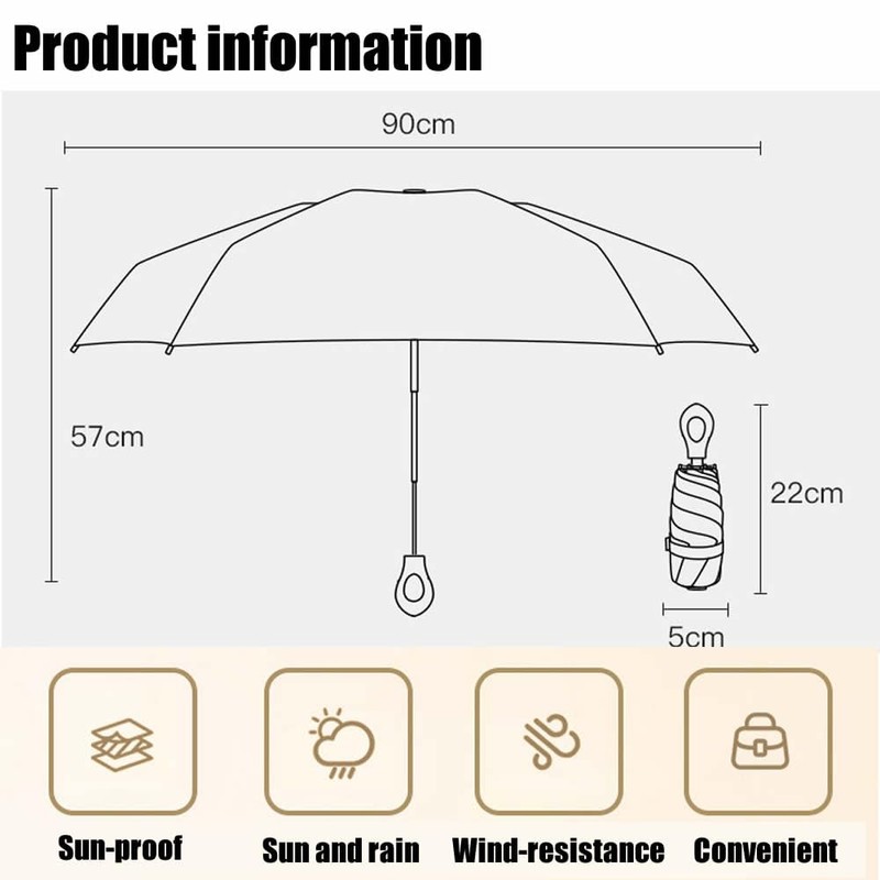 • 🌂Mini Travel Size—— Measuring just 8.5" long and weighing less than 0.55lb the folding handheld umbrella is extremely packable in purses, briefcases, backpacks, luggage,car and more.It provides great convenience for outdoor hiking, camping, walking, fishing and other activities.
