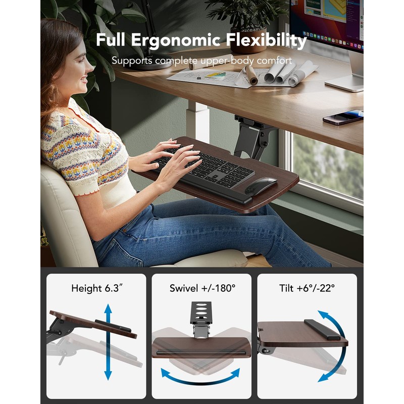 - Full Motion Design - Articulating tray can be swiveled easily 180 degrees left-to-right and tilted by 6 degrees up and 22 degrees down. You also have the ability to adjust the height to achieve your most comfortable typing position.
