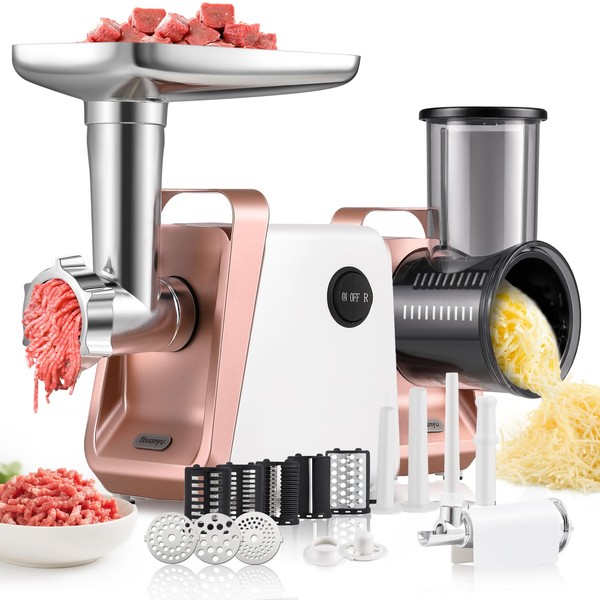 - All-in-One: Huanyu electric meat grinder is really a versatile kitchen tool that grinds meat, stuffs sausages, shreds, grates cheese, and makes juice. The package includes 3 meat grinding plates, 3 sausage tube, 5 blade sets (slicer, wavy, coarse shredder, fine shredder, grater), 1 kibbe kit, and 1 tomato juicer attachment. Perfect for preparing a wide array of fresh and healthy meals with just one appliance