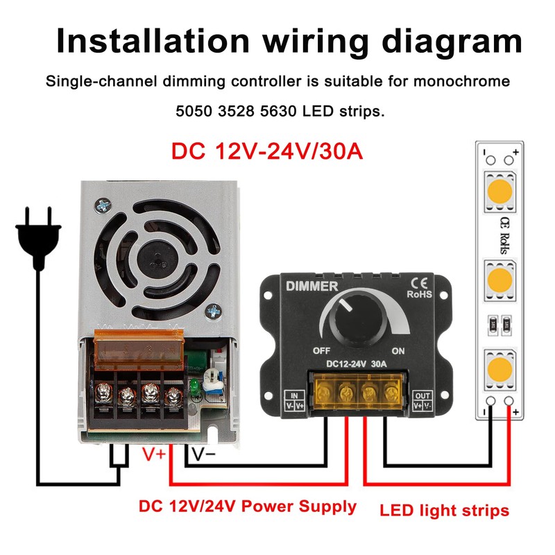 - Compatible: 12V-24V 30A LED dimming switch is mainly used to adjust monochrome LED lights and LED strips, suitable for monochrome 5050 3528 5630 LED strip lights