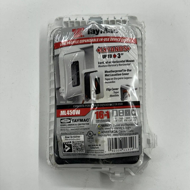This Hubbell TayMac Low Profile Expandable in Use Device Cover 1 Gang Receptacle is a high-quality electrical equipment that is perfect for your business needs. It is a receptacle cover with one gang and one outlet, and it comes in a sleek white color. The model number is ML450W and it is made by the trusted brand Hubbell.