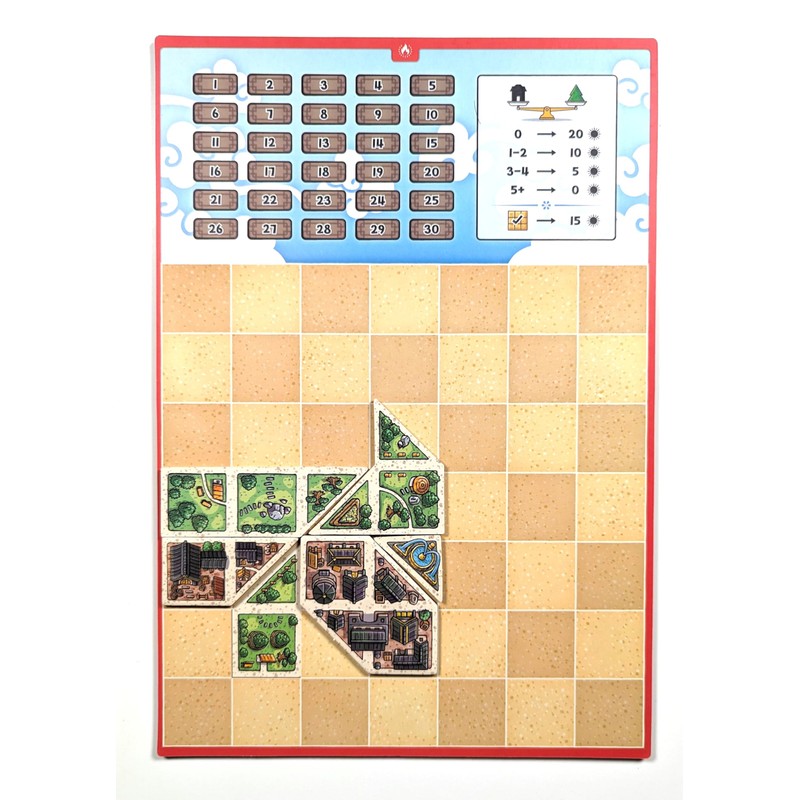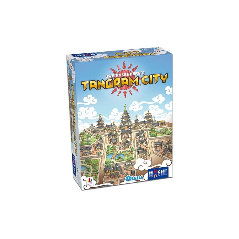 - Tangram City, designed by Uwe Rosenberg, is a very accessible strategy game where players act as city planners. The aim is to create a balance between urbanization (black tiles) and nature (green tiles) on their city board. The dots are marked on each handle according to the largest rectangle created with these tiles, reflecting successful urban planning. Players must also strategically manage the distribution of green spaces to maximize their score and add a level of tactics and thinking to each decision.