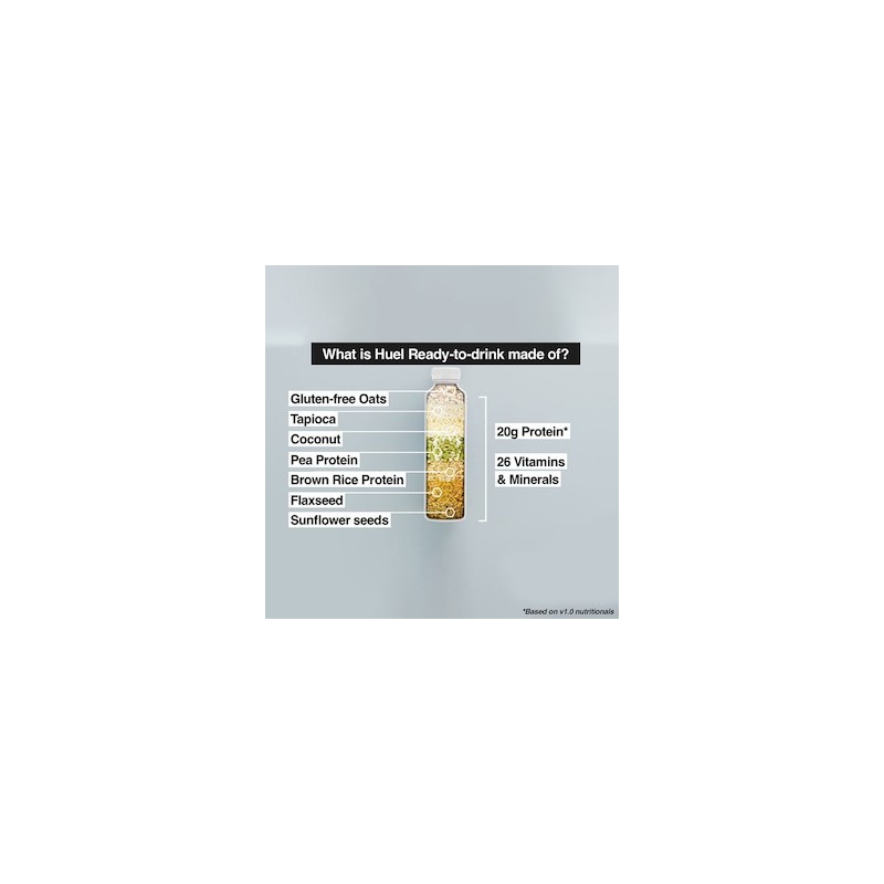 Huel (Human + Fuel) is nutritionally complete drink. This means every Huel meal contains a balance of all 26 essential vitamins and minerals, protein, essential fats, carbs, fibre and phytonutrients in a single product.