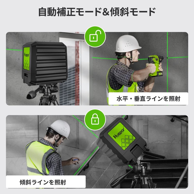 Huepar B011G Green Laser Marker, 2-Line Cross-Line Laser, Automatic Correction, Incline Mode, High Brightness, 6.1 oz (175 g), Lightweight, Easy Operation